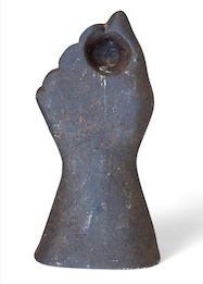 Item #1001 Late 19th century cast iron grandfather clock fist shaped counter balance weight. A cord or wire would slip through a hole at the top in a finger and knotted or encased in the hole in the back. Untouched surface. 5 1/2" tall weighing 3 1/4 pounds. Price on request: email lostfoundart10@gmail.com or call 203-249-0086 |