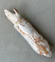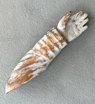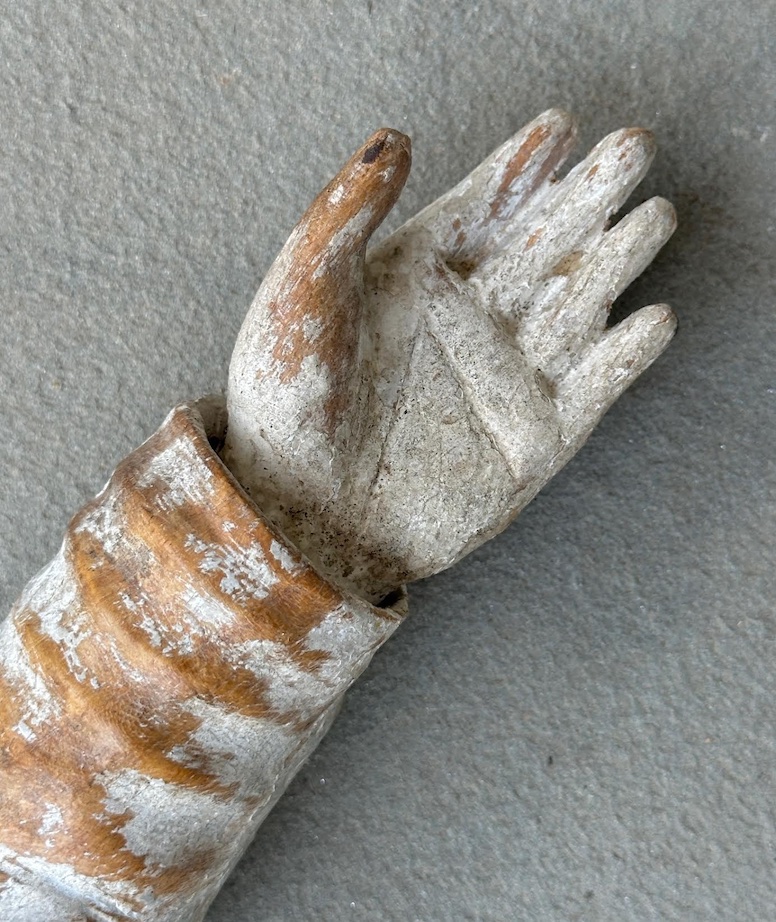Item #99 Unusually large antique mid 19th century carved wooden Santos arm.Unusual to also be found in a hardwood. Bottom of the sleeve has a dowel that runs through the separately carved hand, allowing it to move slightly. Untouched original painted surfaceuntouched surface. Measures 9 3/4" long Price on request: email lostfoundart10@gmail.com or call 203-249-0086 |