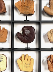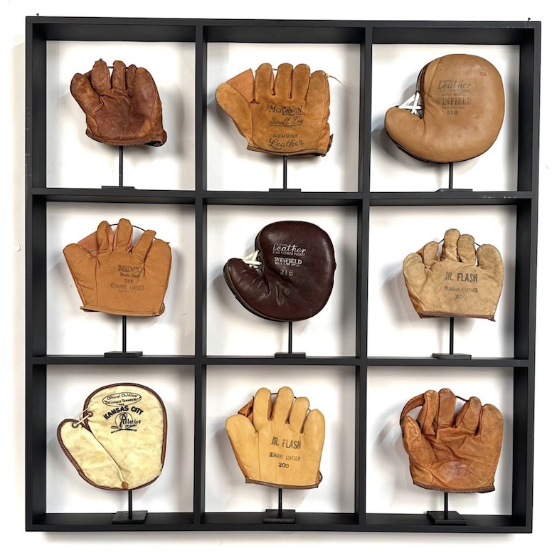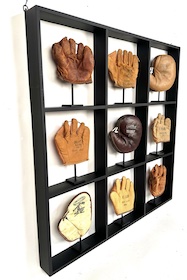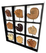 item #618 A custom displayed collection of 9 rare antique small child's baseball gloves. Mounted on custom steel stands inside a cabinetmakers grade black painted maple shadow box. The gloves are circa 1930's -1960's. The display measures 32" x 32" x 2 1/2". For price email or call 203-249-0086