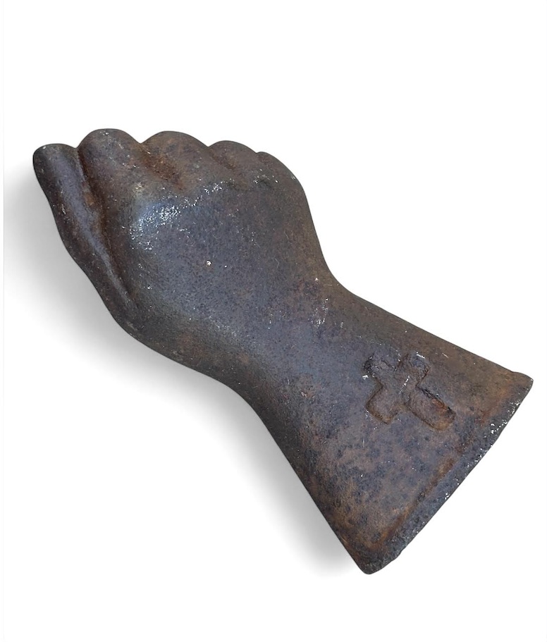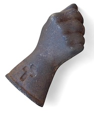 Item #1001 Late 19th century cast iron grandfather clock fist shaped counter balance weight. A cord or wire would slip through a hole at the top in a finger and knotted or encased in the hole in the back. Untouched surface. 5 1/2" tall weighing 3 1/4 pounds. Price on request: email lostfoundart10@gmail.com or call 203-249-0086 |
