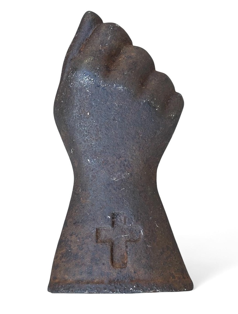 Item #1001 Late 19th century cast iron grandfather clock fist shaped counter balance weight. A cord or wire would slip through a hole at the top in a finger and knotted or encased in the hole in the back. Untouched surface. 5 1/2" tall weighing 3 1/4 pounds. Price on request: email lostfoundart10@gmail.com or call 203-249-0086 |