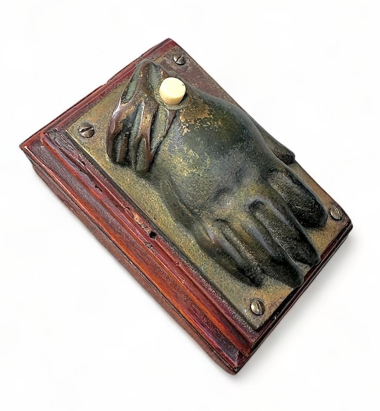 Item #996 Wall mounted antique bronze on wood Victorian room buzzer in the shape of a child's hand. Circa 1910.. Nice original untouched surface. Measures 4 1/4" by 3" and 2 1/4" high. Price on request email lostfoundart10@gmail.com or call 203-249-0086 |
