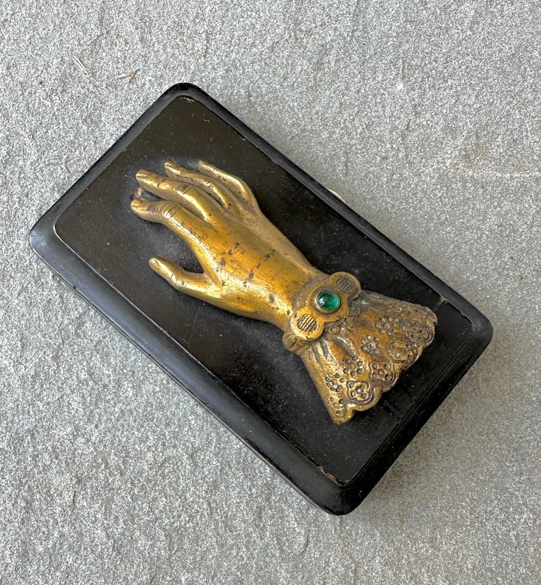 Item #1000 An antique Victorian bronze hand shaped room buzzer mounted on a bakelite base. Measures 4 1/4" x 2 1/2" x 1 1/2" Price on request: email lostfoundart10@gmail.com or call 203-249-0086