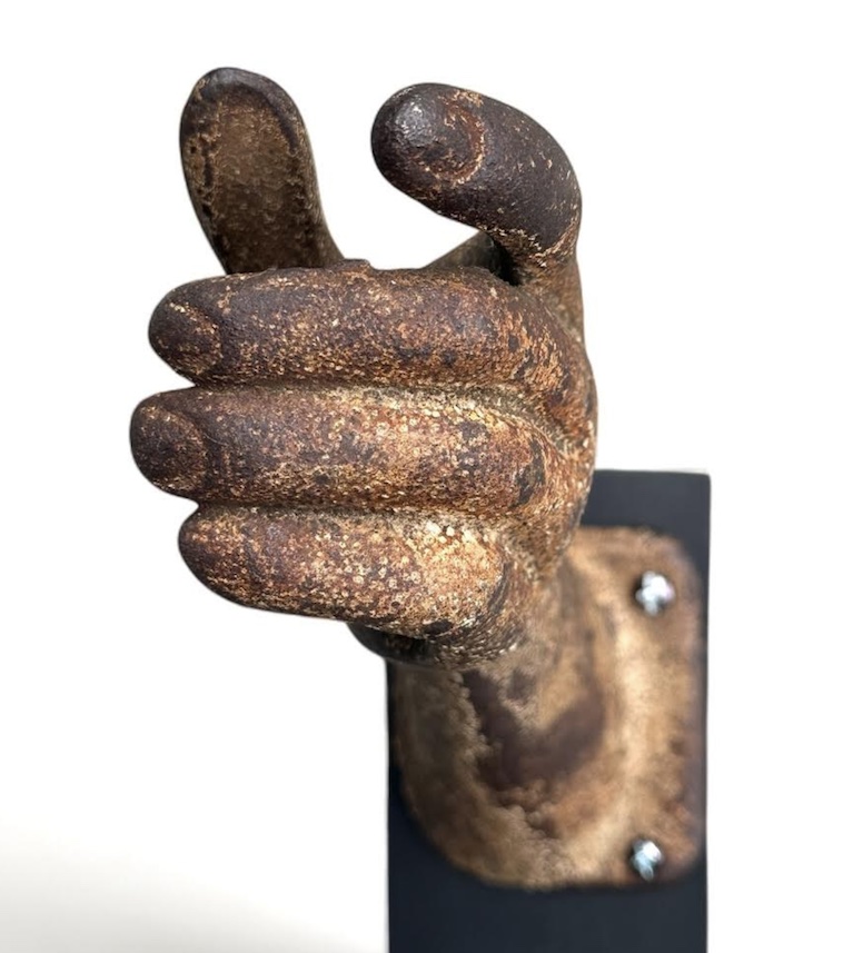 Item #995 Rare antique Whistle Soda cast iron advertising figurative shaped hand. The thumb was made to be unscrewed so a bottle of Whistle Sodea can be placed in the hand. Great original surface. No damage. Mounted on a custom made steel stand. The hand itself is 9" long. Price on request email lostfoundart10@gmail.com or call 203-249-0086